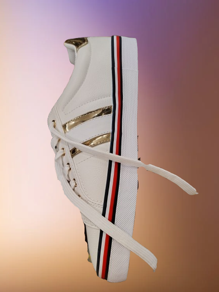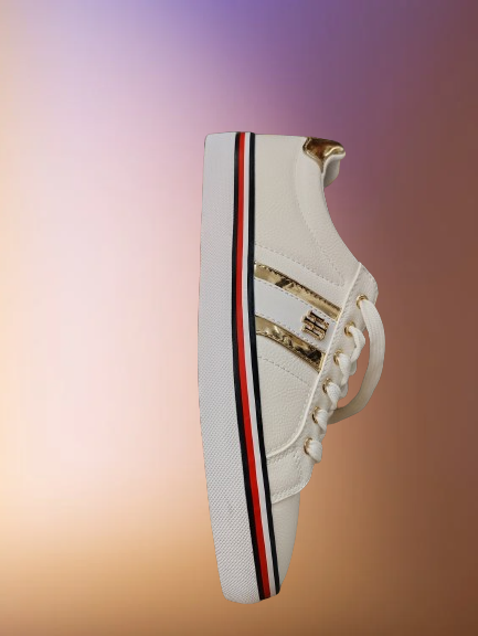 These are lace-up sneakers with a classic, sporty design. They feature a white base with gold-toned accents, including the Tommy Hilfiger logo and stripes on the side.